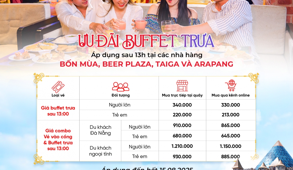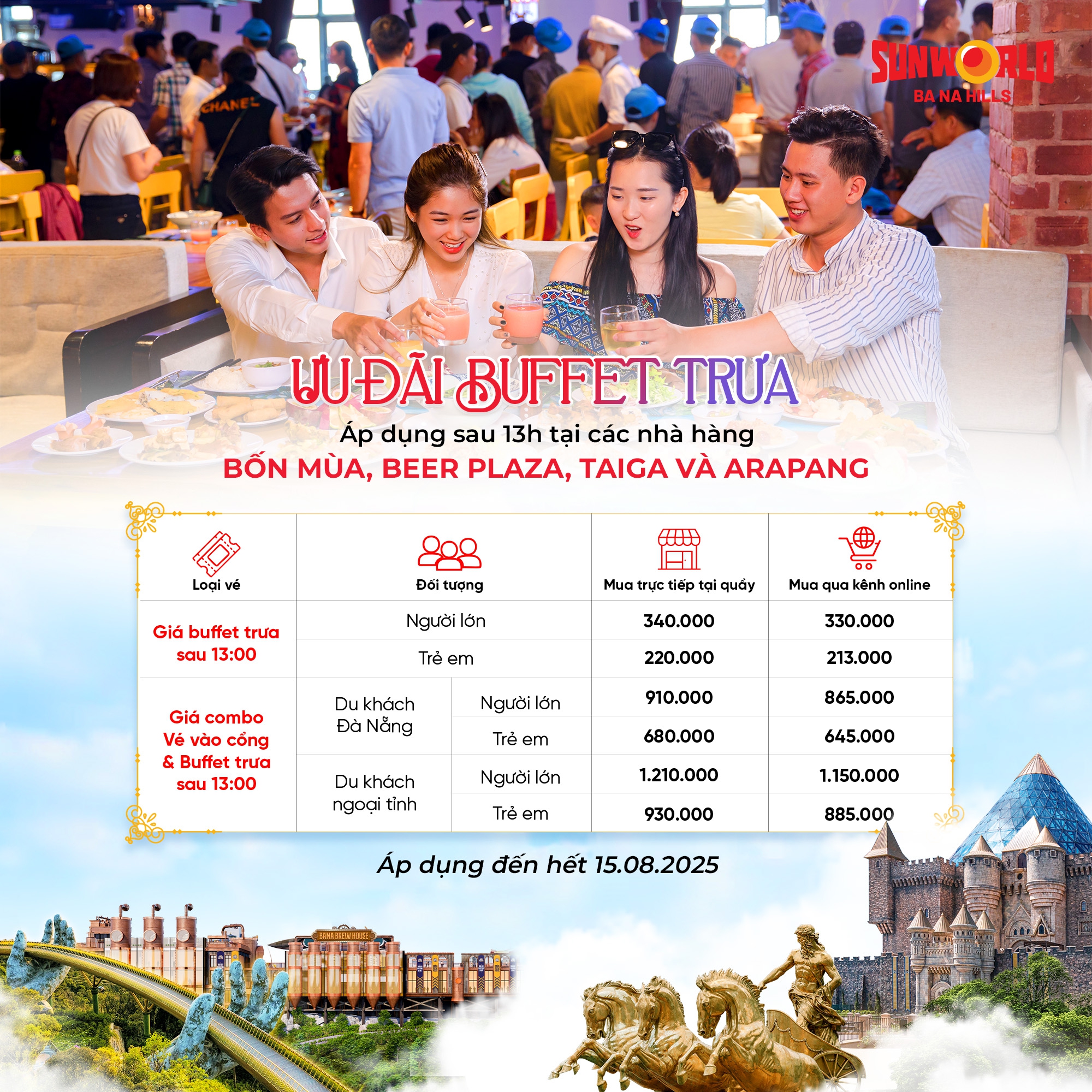 LUNCH BUFFET AFTER 1PM at four restaurants: Bốn Mùa, Arapang, Taiga, and Beer Plaza – eat well, play hard!