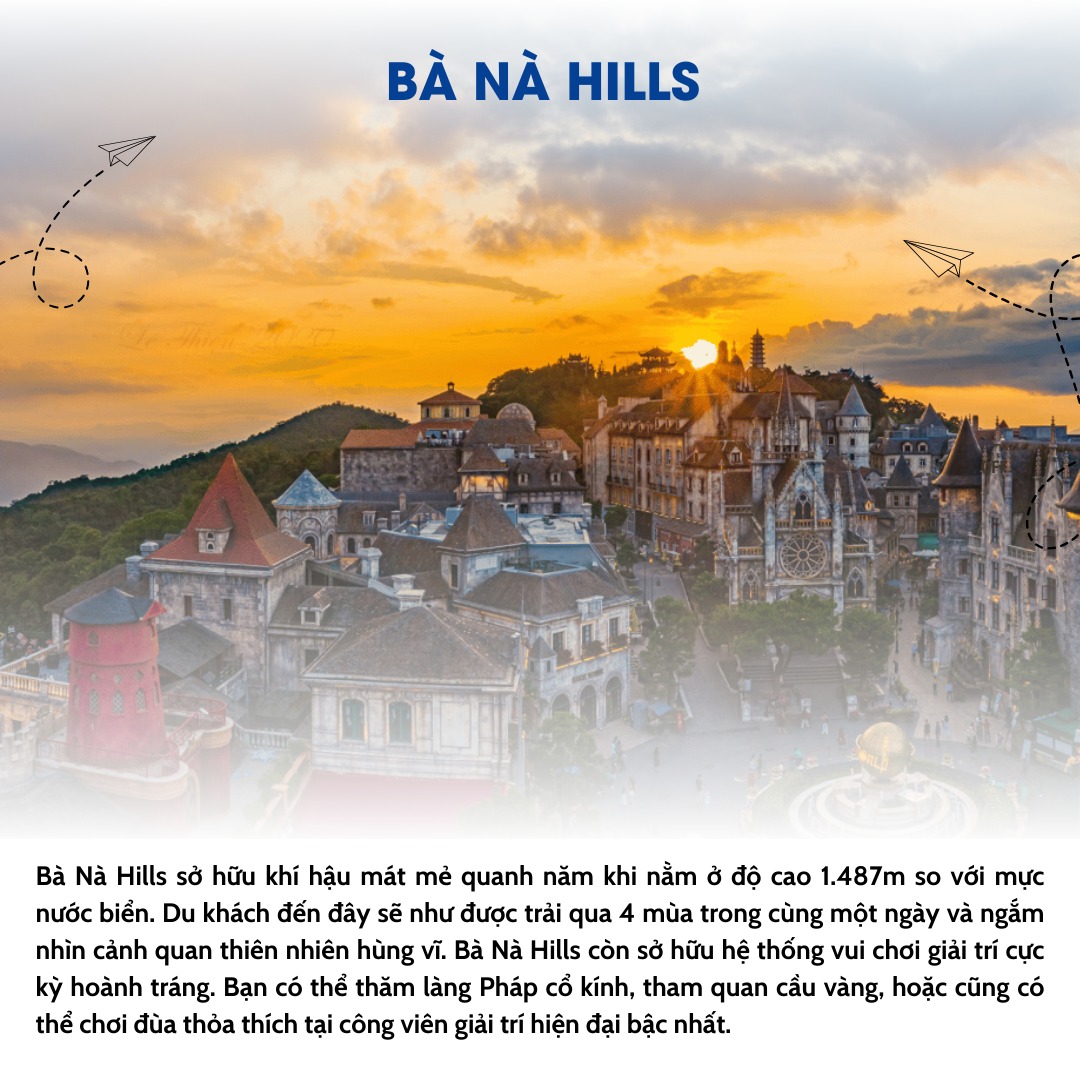 2. Bà Nà Hills: Ở độ cao 1.487m, Bà Nà có khí hậu mát mẻ quanh năm. Du khách sẽ được trải nghiệm 4 mùa trong 1 ngày, tham quan Cầu Vàng nổi tiếng, làng Pháp cổ và vui chơi thỏa thích tại công viên giải trí Fantasy Park.
