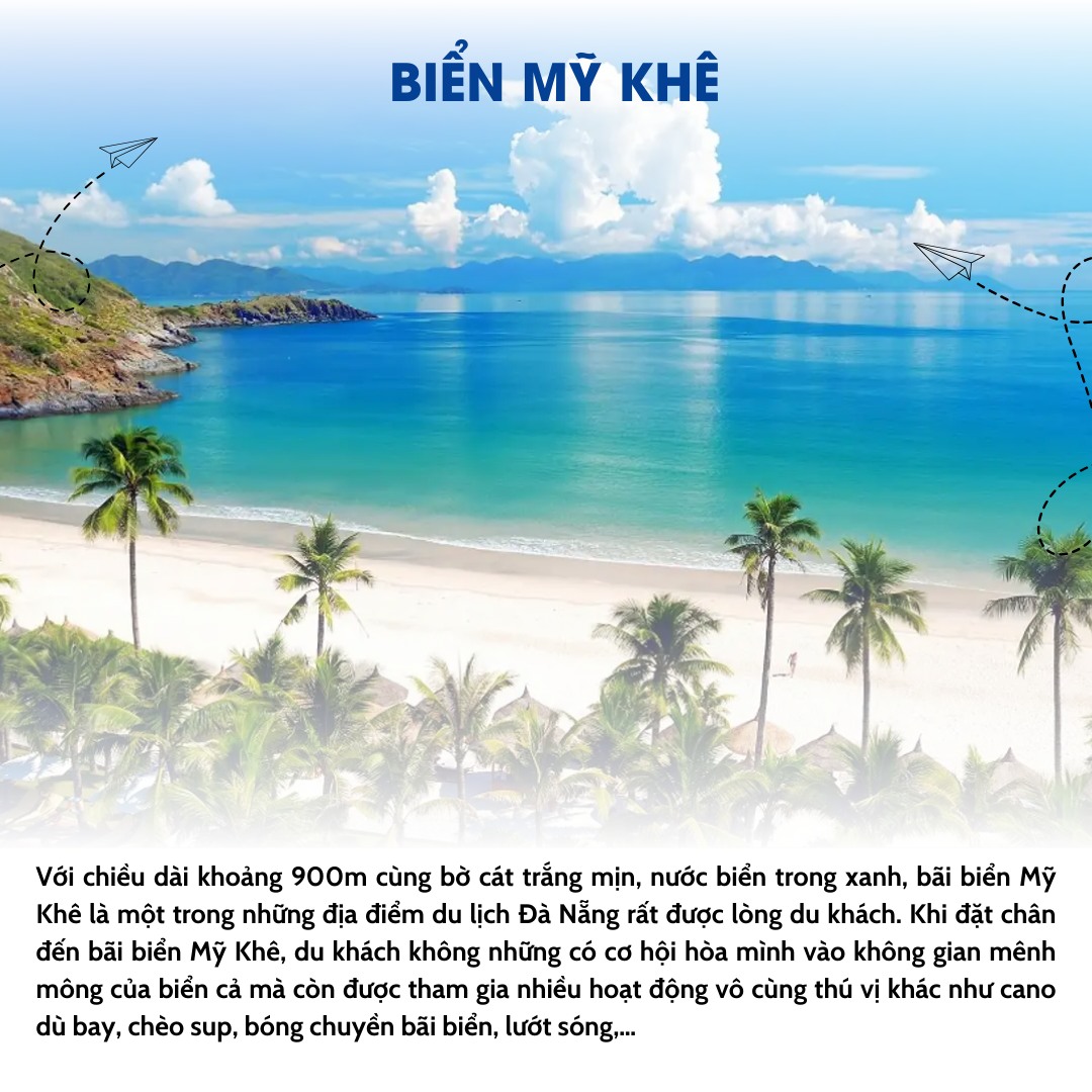 1. Biển Mỹ Khê: Với bờ biển dài 900m, cát trắng mịn và nước biển trong xanh, Mỹ Khê là điểm đến yêu thích của du khách. Ngoài tắm biển, bạn có thể trải nghiệm các hoạt động như cano dù bay, chèo SUP, bóng chuyền bãi biển, lướt sóng,...