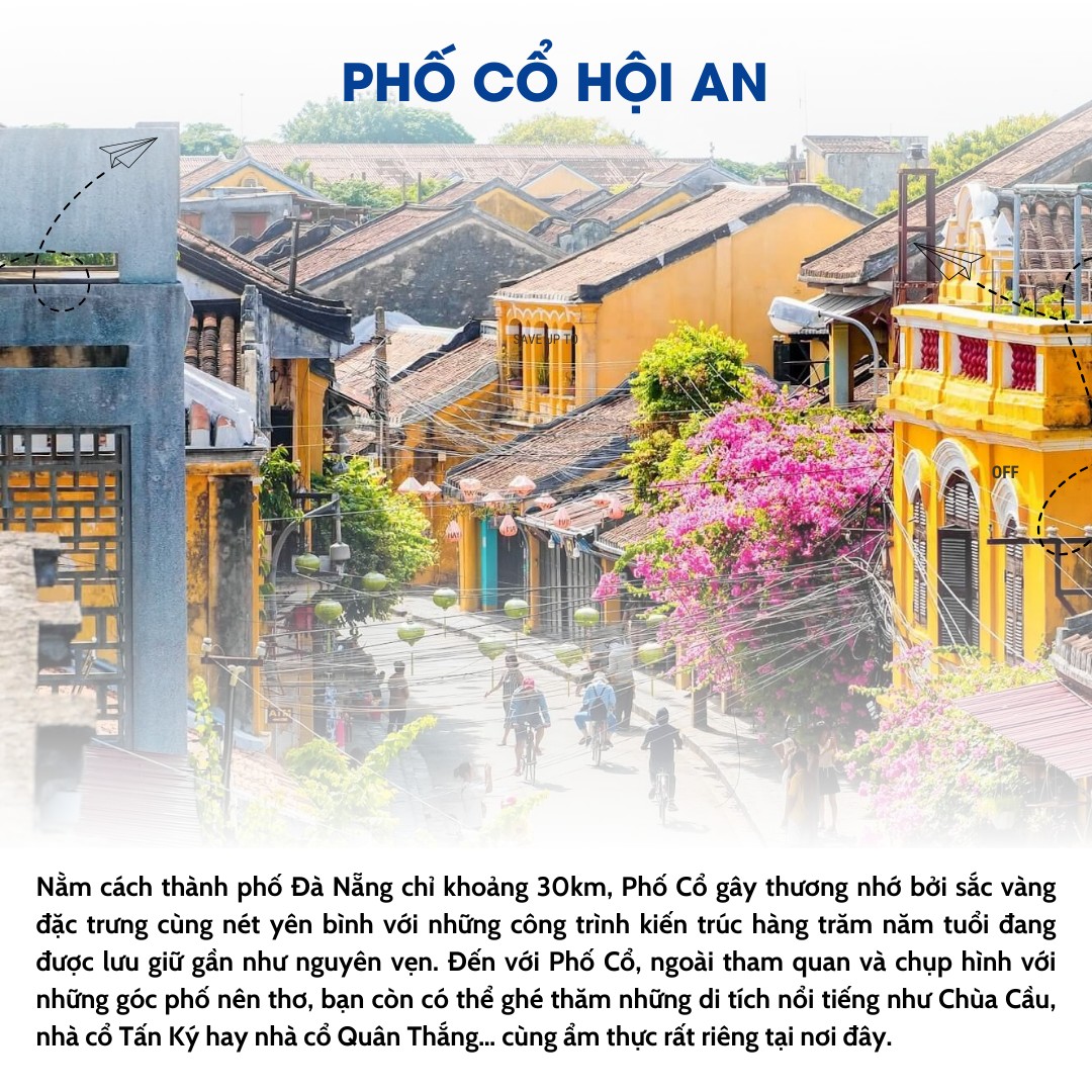 5. Phố Cổ Hội An: Nằm cách trung tâm Đà Nẵng khoảng 30km, Phố Cổ gây thương nhớ bởi sắc vàng đặc trưng và nét yên bình. Bạn có thể dạo phố, chụp hình, ghé thăm Chùa Cầu, nhà cổ Tấn Ký, nhà cổ Quân Thắng và thưởng thức ẩm thực như cao lầu, mì Quảng, cơm gà Hội An ,..