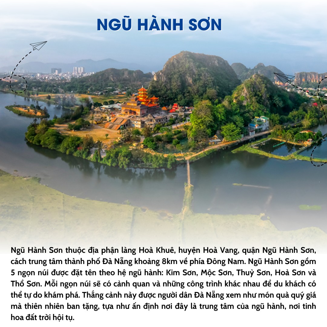 3. Ngũ Hành Sơn: Cách trung tâm khoảng 8km về phía Đông Nam, gồm 5 ngọn núi Kim, Mộc, Thủy, Hỏa, Thổ Sơn. Mỗi núi mang nét đặc trưng riêng, nhiều hang động, chùa chiền linh thiêng và cảnh đẹp tuyệt vời từ đỉnh Thủy Sơn.